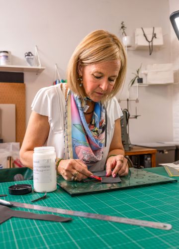 In haar atelier in Schaarbeek, Brussel, maakt An Vandenberk op maat gemaakte lederen tassen van oude leren kledij, deadstock leer en Europese grondstoffen.